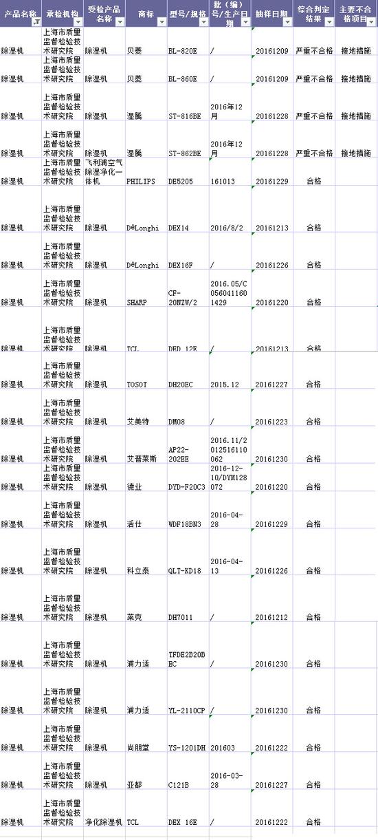 本次抽查的除濕機(jī)品牌包括貝菱、濕騰、PHILIPS、DēLonghi、SHARP、TCL、TOSOT、艾美特、艾普萊斯、德業(yè)、活仕、萊克、科立泰、尚朋堂、浦力適和亞都等21批次產(chǎn)品,其中,貝菱和濕騰旗下的兩款除濕機(jī)在抽查中檢測(cè)發(fā)現(xiàn)產(chǎn)品嚴(yán)重不合格,主要不合格項(xiàng)目為接地措施。